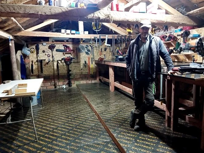 Woodworking is a very mindful activity for me. I'm fortunate that we've built a substantial workshop on our property, where I spend hours. We've used our skills to renovate our home. In fact, our cabin - the house we live in now - we built entirely from scratch using timber we carried down to the property piece by piece. Since we're very remote, we had to drag each piece down the hillside by hand.